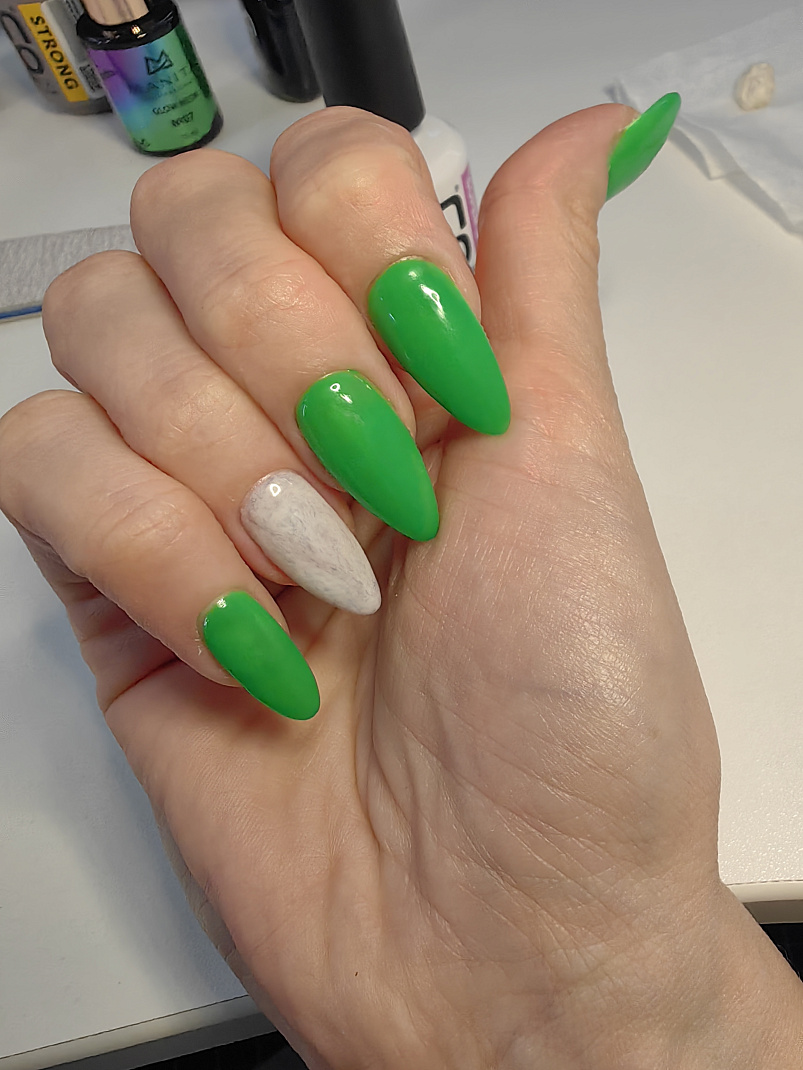 Сегодня я вновь клеила и красила ногти. Приобрела новый зеленый неоновый лак, мне было сложно его наносить, по-хорошему надо делать в три слоя, но я еле-еле осилила два и только 4 ногтя на одной руке (хотя с большого пальца ноготь отвалился через часик и тоже стал светлым). Типсы клеить та еще морока: пока засунешь в лампу он отскакивает от пластины, полностью изнутри не покрывается базой из-за отхождения, не прилегает к родному ногтю - похоже надо приобретать спец фонарик... думаю. Но, в целом, результат нормальный (с затеками, потеками кривухами, но своя работа).