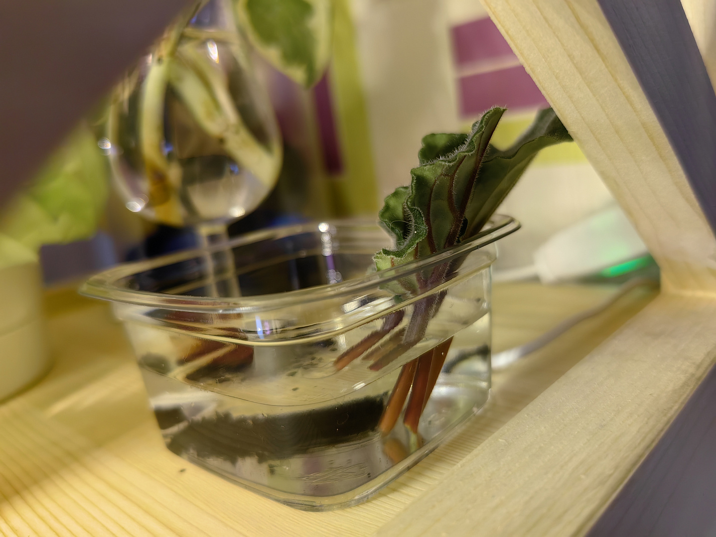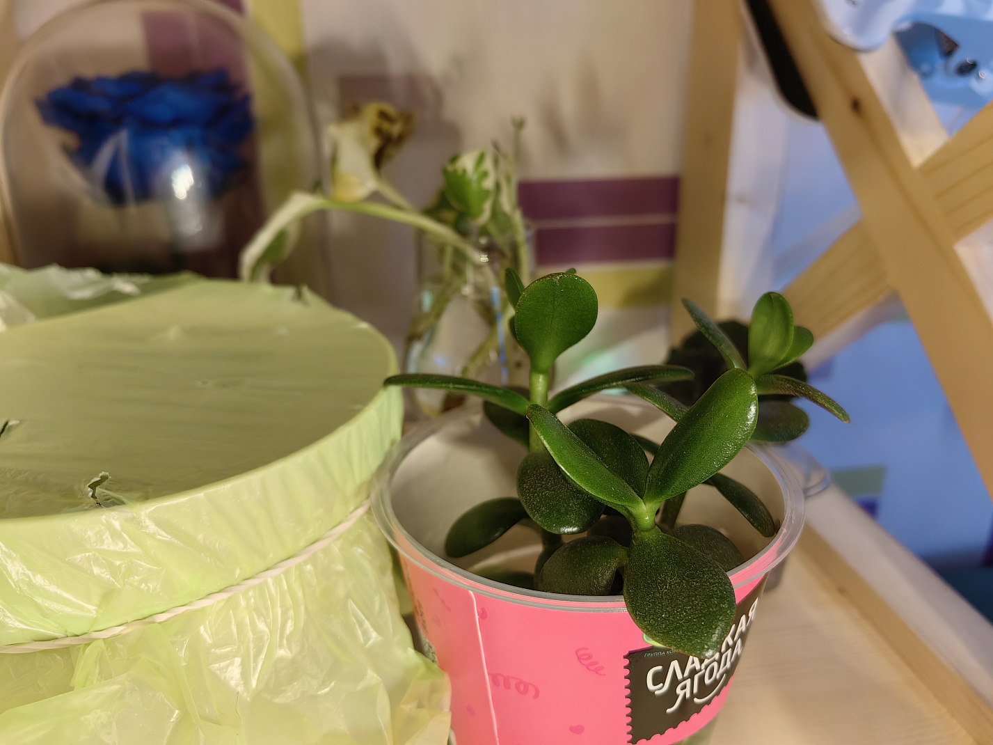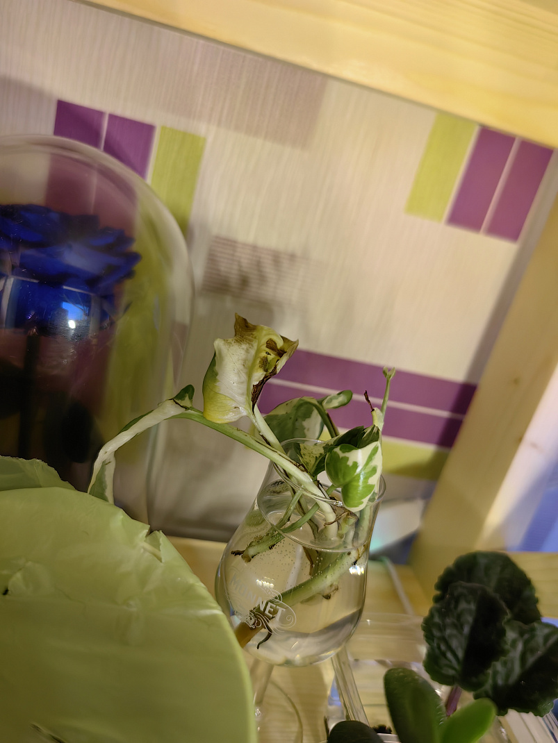 В воде все пытаюсь черенковать различные виды растений: авокадий, фиалкий, красулий и полусгнившие стебли эпипремнумия. У них игра на выживание, болею за всех как за родных. Эпипремнум-мать хочет уйти в мир иной, я ее настоятельно отговариваю. А пенек каланхоэ, который в итоге возродился, все равно покрывается мучнистой росой, опрыскиваю его раствором перекиси каждые три дня.