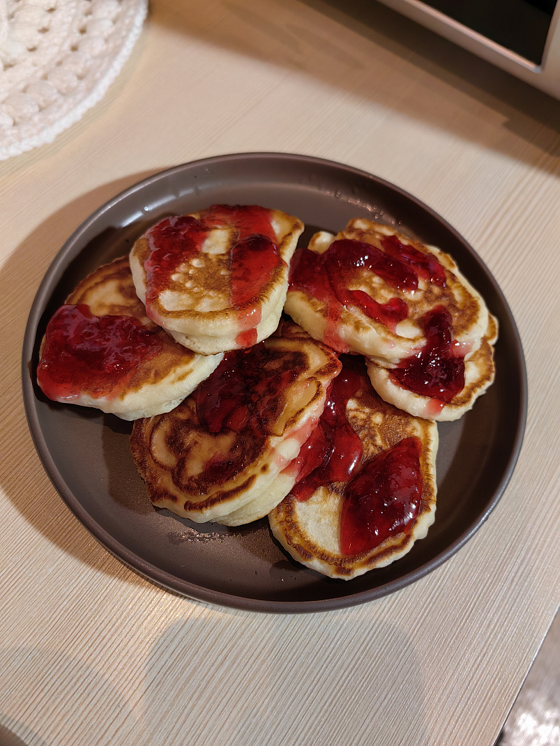 Подаем. Готовые пышные оладьи подавайте сразу к столу со сметаной, вареньем, медом или любым другим любимым топпингом.