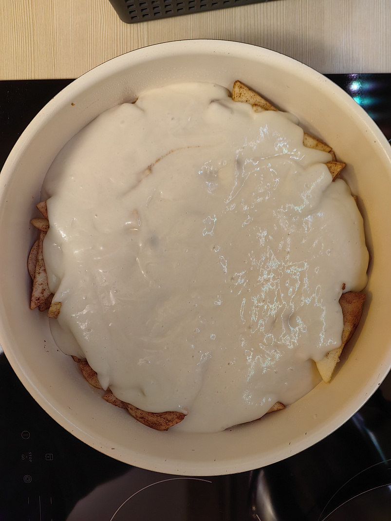 Третий слой: Залейте яблоки оставшимся тестом. Старайтесь покрыть все яблоки, чтобы они не торчали наружу и не подгорели.