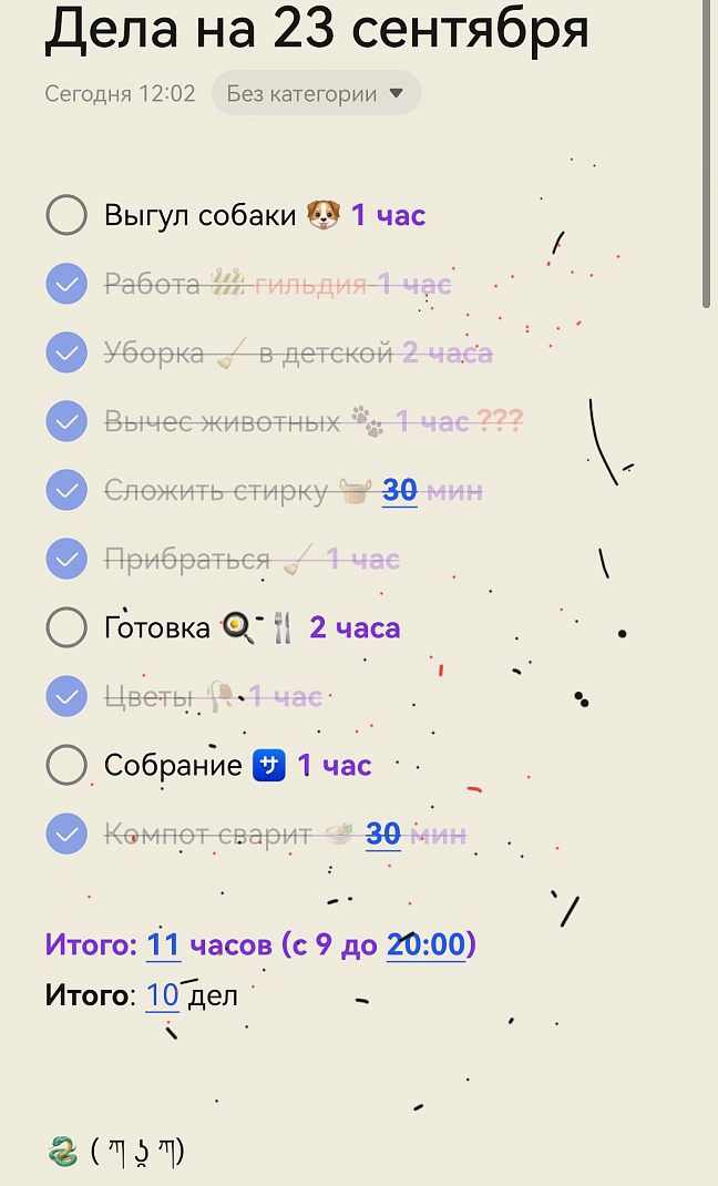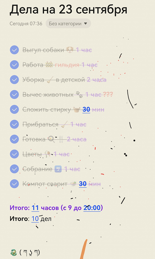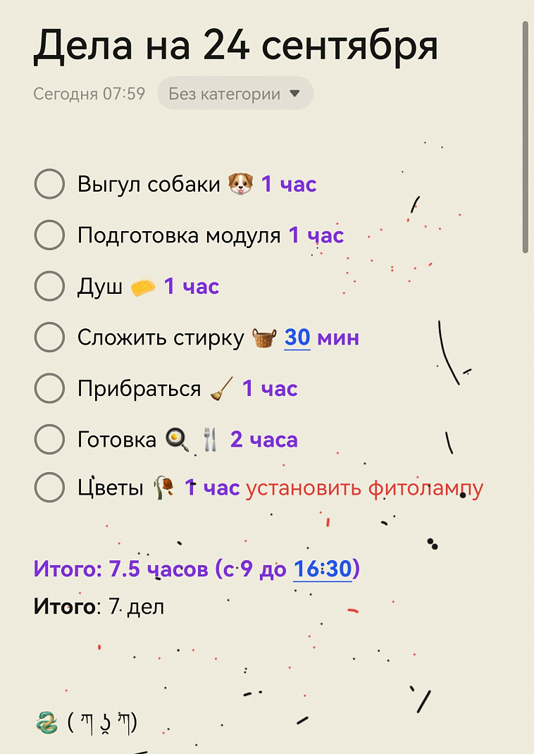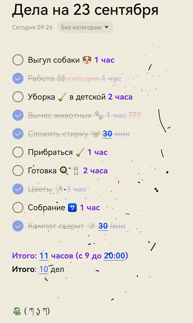 Вывод: все дела из списка выполнены, взяла с полки пирожок, молодец.