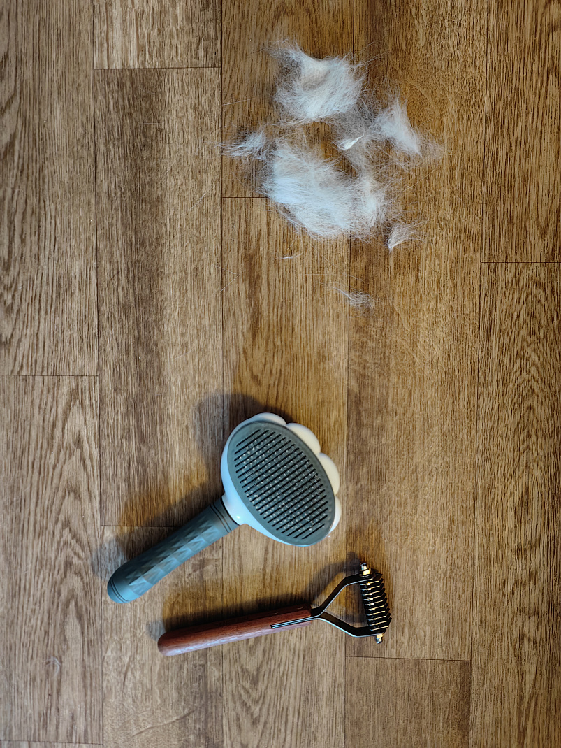 Немного вычесала кошку (3), ибо она норовила убежать и убежала. В принципе, я ее вычесывала уже второй день подряд, и она все равно оставляет свои белые лохмотья везде где только может.